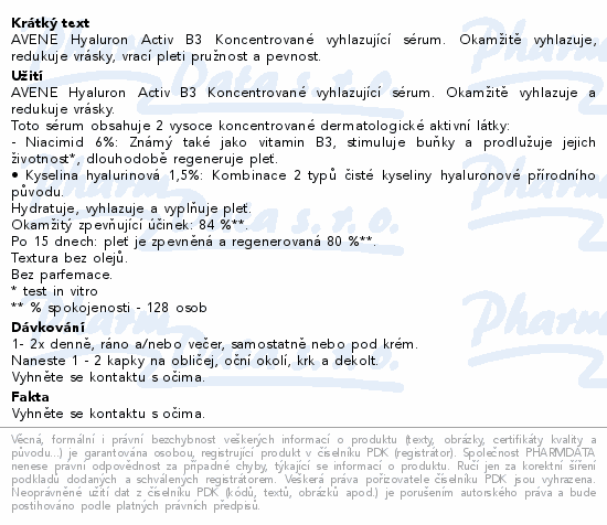 AVENE Hyaluron Activ B3 Koncentrované vyhlazující sérum. Okamžitě vyhlazuje, redukuje vrásky, vrací pleti pružnost a pevnost.