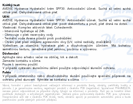 Avène Hydrance Hydratační krém SPF 30 je denní hydratační péče s UV ochranou, určená zejména pro suchou až velmi suchou, dehydratovanou citlivou pleť. Krém obsahuje termální vodu Avène, která zklidňuje a zjemňuje pleť a patentovaný komplex Cohederm™, jenž napomáhá obnovit a udržet optimální hydrataci v hlubších vrstvách pokožky. UV-ochranu zajišťuje systém ochranných filtrů Sunsitive® a pre-tokoferyl, kteří chrání pokožku před negativními vlivy slunečního záření a zpomalují proces fotostárnutí. Krém má lehkou, nemastnou texturu, dobře se vstřebává a nezanechává bílý film. Je nekomedogenní, hypoalergenní a vhodný i pro citlivou pleť se sklonem k zarudnutí nebo diskomfortu. Je ideální jako každodenní denní krém. Aplikuje se ráno na vyčištěnou pleť obličeje a krku, vhodný i jako podklad pod make-up.