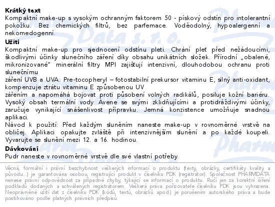 Kompaktní make-up s vysokým ochranným faktorem 50 - pískový odstín pro intolerantní pokožku. Bez chemických filtrů, bez parfemace. Voděodolný, hypoalergenní a nekomedogenní.