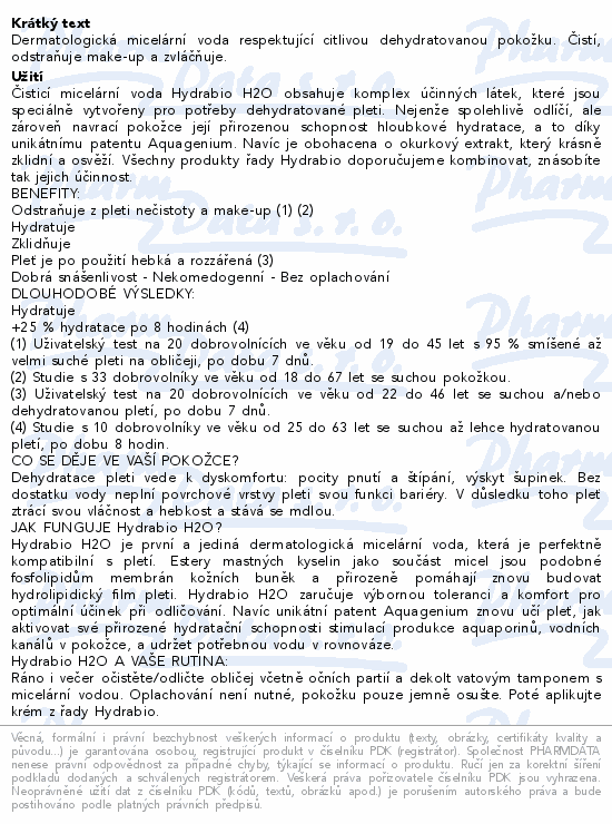 LABORATOIRE BIODERMA Hydrabio H2O 250ml je čisticí a odličovací micelární voda na dehydratovanou a citlivou pleť. Dokonale a jemně čistí, navozuje pocit svěžesti. Důkladně odstraňuje i voděodolný make-up. Nedráždí oči.