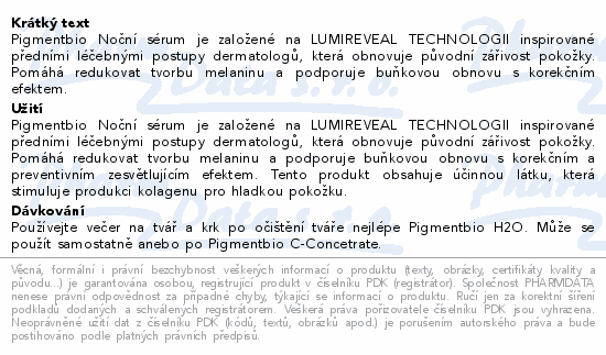 Pigmentbio Noční sérum je založené na LUMIREVEAL TECHNOLOGII inspirované předními léčebnými postupy dermatologů, která obnovuje původní zářivost pokožky. Pomáhá redukovat tvorbu melaninu a podporuje buňkovou obnovu s korekčním efektem.