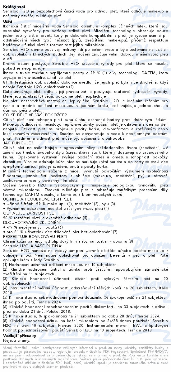 Sensibio H2O - čisticí pleťová voda, micelární roztok pro citlivou pokožku. Dokonale čistí velmi citlivou, tenkou a křehkou kůži a pomáhá odstranit pálivé pocity na kůži. Odstraňuje i voděodolný make-up. Chrání hydrolipidický film pokožky.