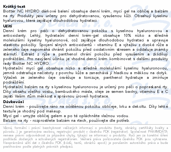 Biotter NC HYDRO dárkové balení obsahuje denní krém, mycí gel na obličej a balzám na rty. Produkty jsou určeny pro dehydratovanou, vysušenou kůži. Obsahují kyselinu hyalurovou, která zajišťuje dlouhodobou hydrataci.