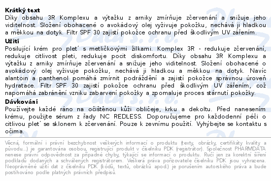 Díky obsahu 3R Komplexu a výtažku z arniky zmírňuje zčervenání a snižuje jeho viditelnost. Složení obohacené o avokádový olej vyživuje pokožku, nechává ji hladkou a měkkou na dotyk. Filtr SPF 30 zajistí pokožce ochranu před škodlivým UV zářením.