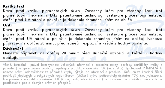 Krém proti vzniku pigmentových skvrn. Ochranný krém pro všechny, kteří trpí pigmentovými skvrnami. Díky patentované technologii zastavuje proces pigmentace, chrání před UV záření a pokožka je dokonale chráněna. Krém na obličej.