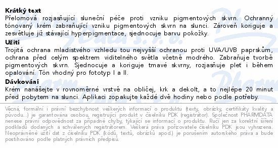 Přelomová rozjasňující sluneční péče proti vzniku pigmentových skvrn. Ochranný tónovaný krém zabraňující vzniku pigmentových skvrn na slunci. Zároveň koriguje a zesvětluje již stávající hyperpigmentace, sjednocuje barvu pokožky.