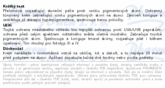 Přelomová rozjasňující sluneční péče proti vzniku pigmentových skvrn. Ochranný tónovaný krém zabraňující vzniku pigmentových skvrn na slunci. Zároveň koriguje a zesvětluje již stávající hyperpigmentace, sjednocuje barvu pokožky.