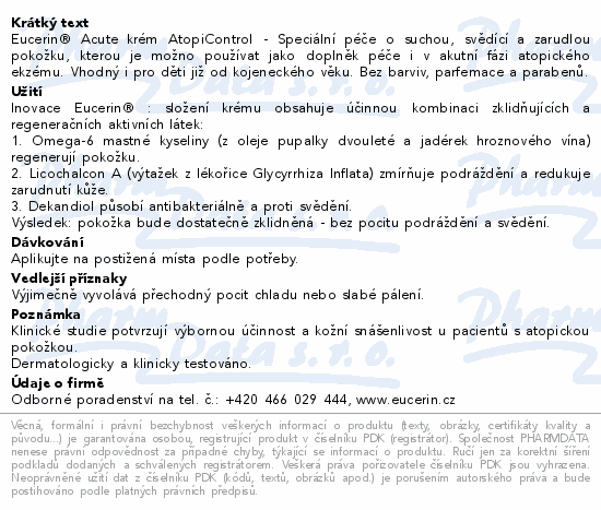 Eucerin® Acute krém AtopiControl - Speciální péče o suchou, svědící a zarudlou pokožku, kterou je možno používat jako doplněk péče i v akutní fázi atopického ekzému. Vhodný i pro děti již od kojeneckého věku. Bez barviv, parfemace a parabenů.