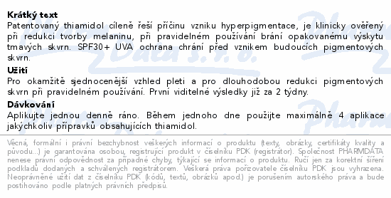 Patentovaný thiamidol cíleně řeší příčinu vzniku hyperpigmentace, je klinicky ověřený při redukci tvorby melaninu, při pravidelném používání brání opakovanému výskytu tmavých skvrn. SPF30+ UVA ochrana chrání před vznikem budoucích pigmentových skvrn.