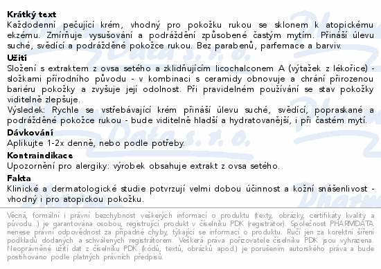 Každodenní pečující krém, vhodný pro pokožku rukou se sklonem k atopickému ekzému. Zmírňuje vysušování a podráždění způsobené častým mytím. Přináší úlevu suché, svědící a podrážděné pokožce rukou. Bez parabenů, parfemace a barviv.