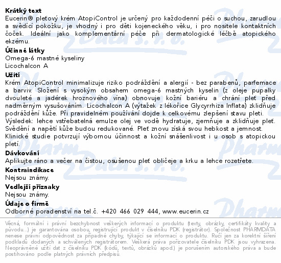 Eucerin® pleťový krém AtopiControl je určený pro každodenní péči o suchou, zarudlou a svědící pokožku, je vhodný i pro děti kojeneckého věku, i pro nositele kontaktních čoček. Ideální jako komplementární péče při dermatologické léčbě atopického ekzému.