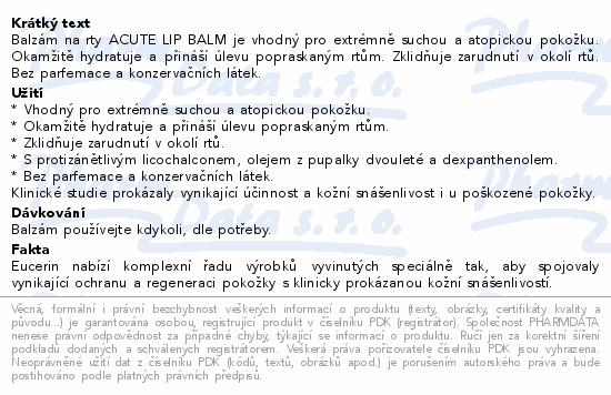 Balzám na rty ACUTE LIP BALM je vhodný pro extrémně suchou a atopickou pokožku. Okamžitě hydratuje a přináší úlevu popraskaným rtům. Zklidňuje zarudnutí v okolí rtů. Bez parfemace a konzervačních látek.