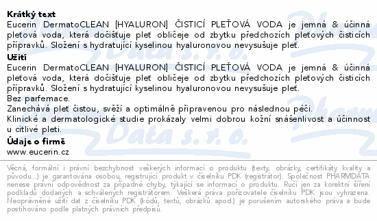 Eucerin DermatoCLEAN [HYALURON] ČISTICÍ PLEŤOVÁ VODA je jemná & účinná pleťová voda, která dočišťuje pleť obličeje od zbytku předchozích pleťových čisticích přípravků. Složení s hydratující kyselinou hyaluronovou nevysušuje pleť.