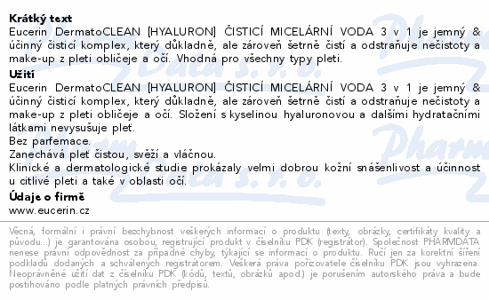 Eucerin DermatoCLEAN [HYALURON] ČISTICÍ MICELÁRNÍ VODA 3 v 1 je jemný & účinný čisticí komplex, který důkladně, ale zároveň šetrně čistí a odstraňuje nečistoty a make-up z pleti obličeje a očí. Vhodná pro všechny typy pleti.