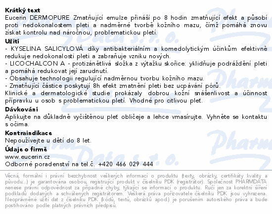 Eucerin DERMOPURE Zmatňující emulze přináší po 8 hodin zmatňující efekt a působí proti nedokonalostem pleti a nadměrné tvorbě kožního mazu, čímž pomáhá znovu získat kontrolu nad náročnou, problematickou pletí.