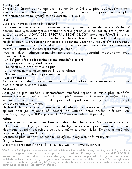 EUCERIN SUN Oil Control Dry Touch SPF 50+ je ochranný gel-krém na obličej určený pro mastnou, smíšenou a aknózní pleť. Textura přípravku je ultra-lehká, nemastná a nelepivá, dále je bez parfemace, nekomedogenní a má velmi dobrou kožní snášenlivost. Vhodný i pod make-up. Přípravek využívá pokročilou technologii spektrální ochrany s kombinací účinných UV filtrů a antioxidantů (např. líkohalkon A a kyselina glycyrrhetinová), které chrání pokožku před poškozením způsobeným slunečním zářením a volnými radikály. Součástí složení je také technologie Oil Control s matujícími mikročásticemi, které zajišťují dlouhotrvající zmatnění až na 8 hodin.