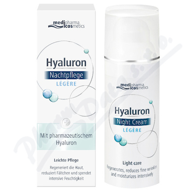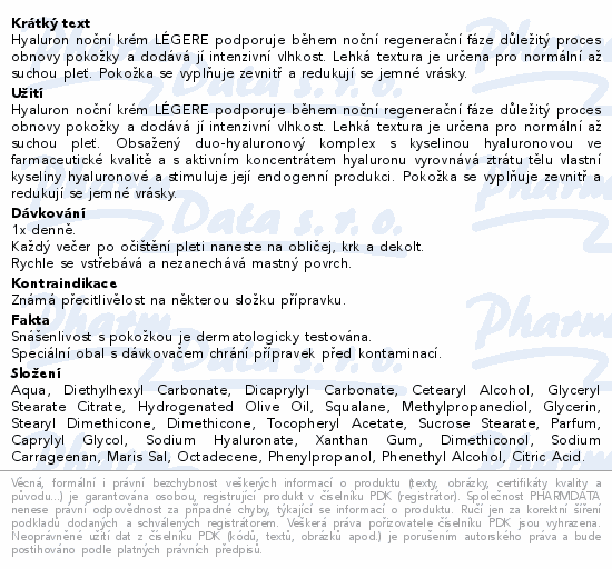Hyaluron noční krém LÉGERE podporuje během noční regenerační fáze důležitý proces obnovy pokožky a dodává jí intenzivní vlhkost. Lehká textura je určena pro normální až suchou pleť. Pokožka se vyplňuje zevnitř a redukují se jemné vrásky.