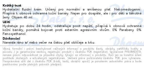 Hydratační fluidní krém. Určený pro normální a smíšenou pleť. Nekomedogenní. Přispívá k obnově ochranné kožní bariéry. Nejen pro dospělé, ale i pro děti a těhotné ženy. Objem 40 ml.