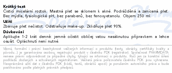 Čisticí micelární roztok. Mastná pleť se sklonem k akné. Podrážděná a zanícená pleť. Bez mýdla, fysiologické pH, bez parabenů, bez fenoxyetanolu. Objem 250 ml.