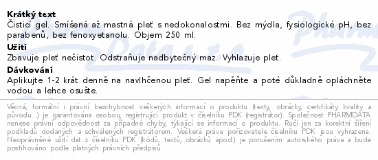 Čisticí gel. Smíšená až mastná pleť s nedokonalostmi. Bez mýdla, fysiologické pH, bez parabenů, bez fenoxyetanolu. Objem 250 ml.