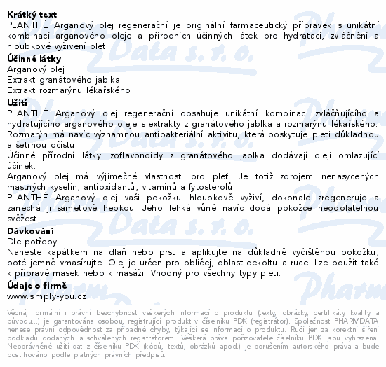 PLANTHÉ Arganový olej regenerační je originální farmaceutický přípravek s unikátní kombinací arganového oleje a přírodních účinných látek pro hydrataci, zvláčnění a hloubkové vyživení pleti.