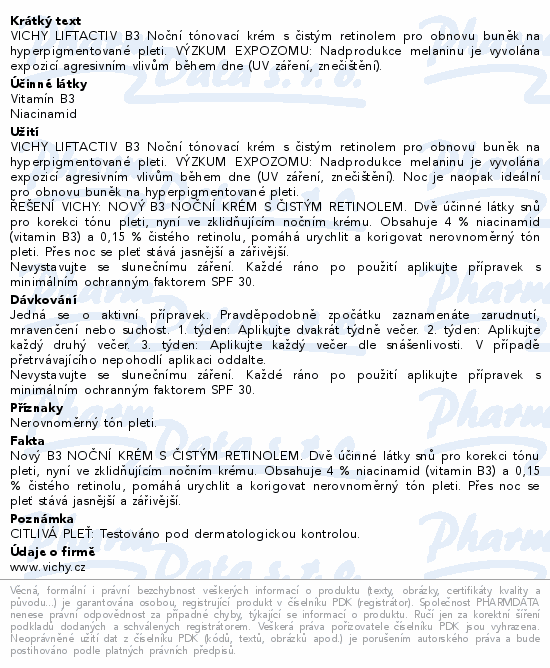 VICHY LIFTACTIV B3 Noční tónovací krém s čistým retinolem pro obnovu buněk na hyperpigmentované pleti. VÝZKUM EXPOZOMU: Nadprodukce melaninu je vyvolána expozicí agresivním vlivům během dne (UV záření, znečištění).