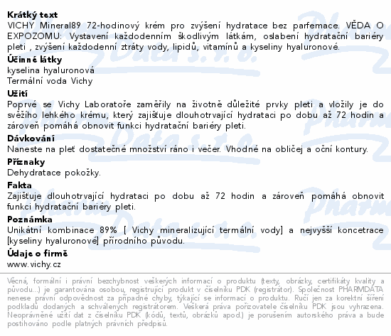 VICHY Mineral89 72-hodinový krém pro zvýšení hydratace bez parfemace. VĚDA O EXPOZOMU: Vystavení každodenním škodlivým látkám, oslabení hydratační bariéry pleti , zvýšení každodenní ztráty vody, lipidů, vitamínů a kyseliny hyaluronové.