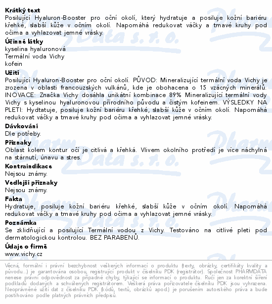 Posilující Hyaluron-Booster vznikl unikátní kombinací 89 % mineralizující termální vody Vichy s kyselinou hyaluronovou přírodního původu a čistým kofeinem. Díky svému složení hydtatuje, posiluje kožní bariéru křehké, slabší kůže v očním okolí. Napomáhá redukovat váčky a tmavé kruhy pod očima a vyhlazovat jemné vrásky. Booster je testován pod dermatologickou a oftamologickou kontrolou. Hypoalergenní. Vhodný pro pro citlivé oči a uživatele kontatních čoček.