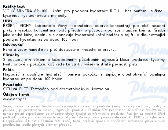 VICHY MINERAL89 100H krém pro podporu hydratace RICH - bez parfemu s čistou kyselinou hyaluronovou a minerály.