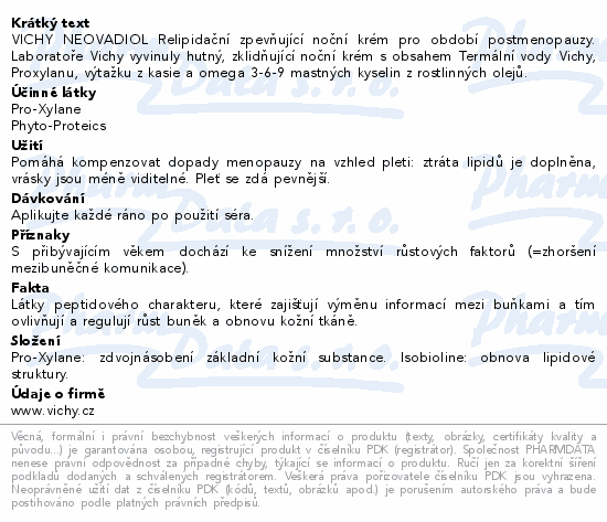 VICHY NEOVADIOL Relipidační zpevňující noční krém pro období postmenopauzy. Laboratoře Vichy vyvinuly hutný, zklidňující noční krém s obsahem Termální vody Vichy, Proxylanu, výtažku z kasie a omega 3-6-9 mastných kyselin z rostlinných olejů.