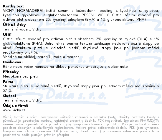 VICHY NORMADERM čistící sérum a každodenní peeling s kyselinou salicylovou, kyselinou glykolovou a glukonolaktonem. ŘEŠENÍ VICHY: Čisticí sérum vhodné pro citlivou pleť s obsahem 2% kyseliny salicylové (BHA) a 1% glukonolaktonu (PHA).