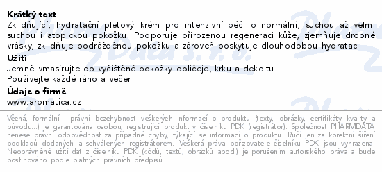 Zklidňující, hydratační pleťový krém pro intenzivní péči o normální, suchou až velmi suchou i atopickou pokožku. Podporuje přirozenou regeneraci kůže, zjemňuje drobné vrásky, zklidňuje podrážděnou pokožku a zároveň poskytuje dlouhodobou hydrataci.