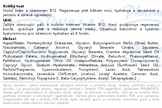 Noční krém s vitaminem B12. Regeneruje pleť během noci, hydratuje a zanechává ji jemnou a zdravě vypadající.