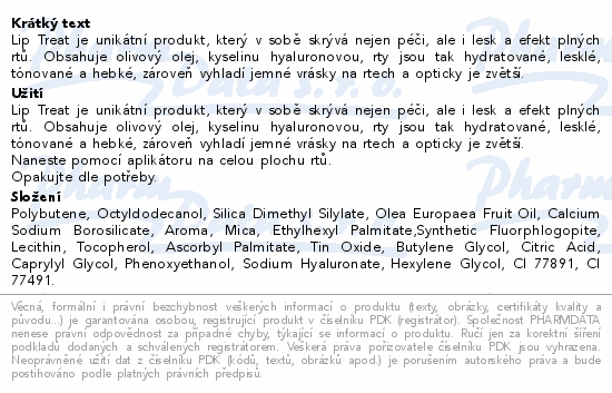 Lip Treat je unikátní produkt, který v sobě skrývá nejen péči, ale i lesk a efekt plných rtů. Obsahuje olivový olej, kyselinu hyaluronovou, rty jsou tak hydratované, lesklé, tónované a hebké, zároveň vyhladí jemné vrásky na rtech a opticky je zvětší.