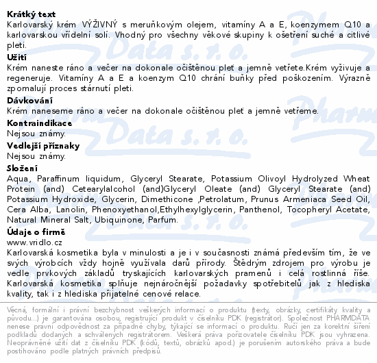 Karlovarský krém VÝŽIVNÝ s meruňkovým olejem, vitamíny A a E, koenzymem Q10 a karlovarskou vřídelní solí. Vhodný pro všechny věkové skupiny k ošetření suché a citlivé pleti.