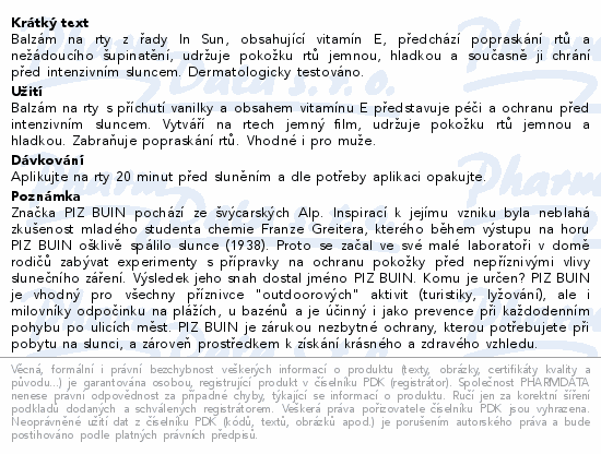 Balzám na rty z řady In Sun, obsahující vitamín E, předchází popraskání rtů a nežádoucího šupinatění, udržuje pokožku rtů jemnou, hladkou a současně ji chrání před intenzivním sluncem. Dermatologicky testováno.