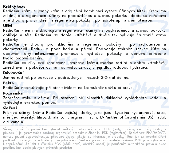 RadioXar krém je jemný krém s originální kombinací vysoce účinných látek. Krém má zklidňující a regenerační účinky na podrážděnou a suchou pokožku, dobře se vstřebává a je vhodný pro zklidnění a regeneraci pokožky i po radioterapii a chemoterapii.