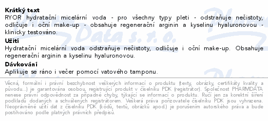 RYOR hydratační micelární voda - pro všechny typy pleti - odstraňuje nečistoty, odličuje i oční make-up - obsahuje regenerační arginin a kyselinu hyaluronovou - klinicky testováno.