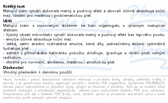 Matující krém vytváří dokonale matný a pudrový efekt a zároveň účinně absorbuje kožní maz. Ideální pro mastnou i problematickou pleť.