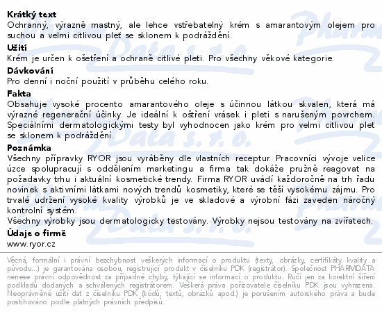 Ochranný, výrazně mastný, ale lehce vstřebatelný krém s amarantovým olejem pro suchou a velmi citlivou pleť se sklonem k podráždění.