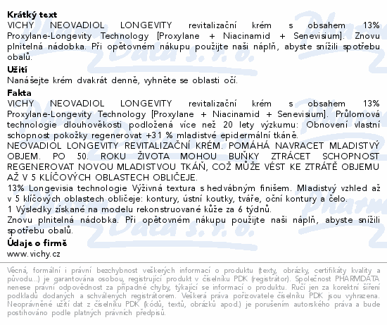 VICHY NEOVADIOL LONGEVITY revitalizační krém s obsahem 13% Proxylane-Longevity Technology [Proxylane + Niacinamid + Senevisium]. Znovu plnitelná nádobka. Při opětovném nákupu použijte naši náplň, abyste snížili spotřebu obalů.