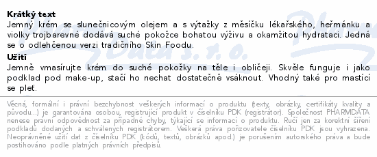 Jemný krém se slunečnicovým olejem a s výtažky z měsíčku lékařského, heřmánku a violky trojbarevné dodává suché pokožce bohatou výživu a okamžitou hydrataci. Jedná se o odlehčenou verzi tradičního Skin Foodu.