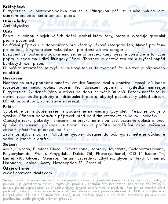 Bustyceutical je biotechnologická emulze s liftingovou péčí se silným vyhlazujícím účinkem pro zpevnění a tonizaci poprsí.