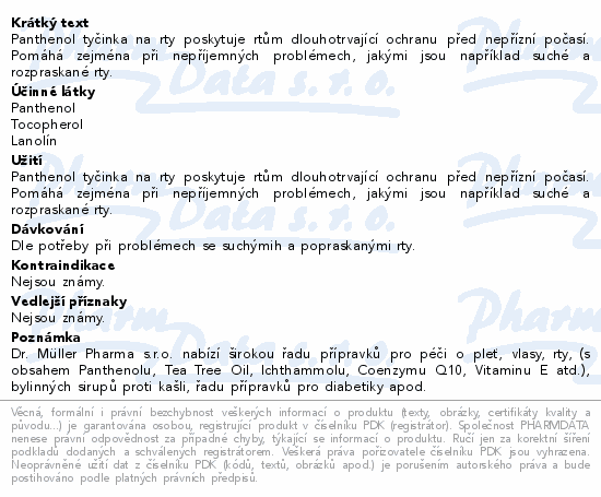 Panthenol tyčinka na rty poskytuje rtům dlouhotrvající ochranu před nepřízní počasí. Pomáhá zejména při nepříjemných problémech, jakými jsou například suché a rozpraskané rty.