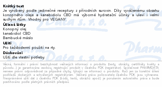 Je vyrobený podle jedinečné receptury z přírodních surovin. Díky vyváženému obsahu konopného oleje a kanabidiolu CBD má výborné hydratační účinky a uleví i velmi suchým rtům. Vhodný pro VEGANY.