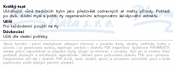 Uklidňující vůně tradičních bylin jako předzvěst ozdravných sil matky přírody. Pohladí po duši, zklidní mysl a pohltí rty regeneračními schopnostmi šalvějového extraktu.