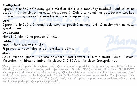 Opárek je hnědý průhledný gel z výtažku bílé lilie a meduňky lékařské. Používá se na ošetření rtů náchylných na častý výskyt oparů. Dobře se nanáší na postižené místo, kde po zaschnutí vytváří ochrannou bariéru před vnějšími vlivy.