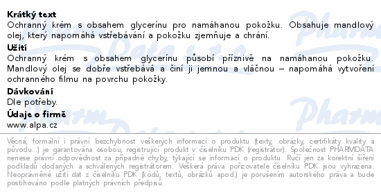 Ochranný krém s obsahem glycerínu pro namáhanou pokožku. Obsahuje mandlový olej, který napomáhá vstřebávání a pokožku zjemňuje a chrání.