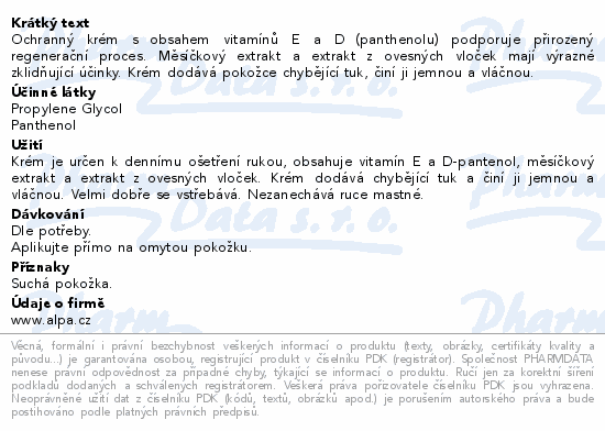 Ochranný krém s obsahem vitamínů E a D (panthenolu) podporuje přirozený regenerační proces. Měsíčkový extrakt a extrakt z ovesných vloček mají výrazné zklidňující účinky. Krém dodává pokožce chybějící tuk, činí ji jemnou a vláčnou.