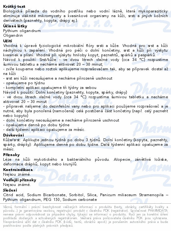 Biologická přísada do vodního postřiku nebo vodní lázně, která mykoparaziticky eliminuje vláknité mikromycety a kvasinkové organismy na kůži, srsti a jiných kožních derivátech (paznehty, kopyta, drápy aj.).